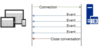 SSE connection chỉ có thể push data đến browser (browser chỉ có thể subscribe để nhận dữ liệu update từ server, chứ không thể gửi bất kỳ dữ liệu nào đến server). 00:00:00 CLIENT-> I need cakes 00:00:02 SERVER-> Have cake-1. 00:00:04 SERVER-> Have cake-2. 00:00:05 CLIENT-> Enough, I'm full. Các ứng dụng thực tiễn: Twitter updates, Stock quotes, Notifications đến browser. Nhược điểm: - Một số browser không support SSE. - Số lượng open connection tối đa chỉ từ 6–8 trên HTTP/1.1 (dựa trên từng phiên bản browser). Nếu bạn dùng HTTP/2, sẽ không còn là vấn đề nữa vì một TCP connection là đủ cho toàn bộ các request. (multiplexed support in HTTP/2)