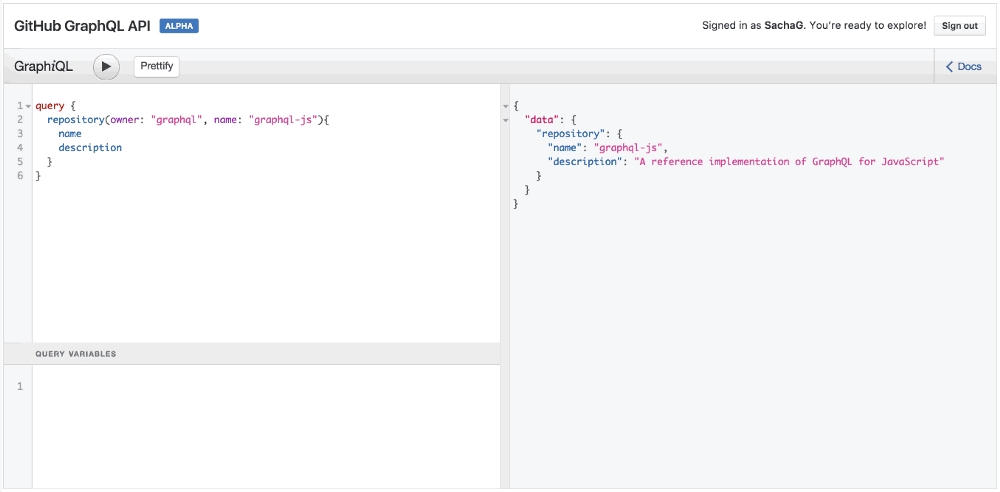 }Một cách thực hành khá tốt là sử dụng GitHub’s GraphQLAPI Explorer. Hãy thử query sau: