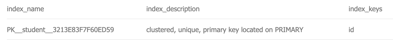 Lưu ý ở đây trong bảng "student", mình đã đặt ràng buộc khóa chính trên cột "id". Điều này tự động tạo một chỉ mục được phân nhóm trên cột "id". Để xem tất cả các chỉ mục trên một bảng cụ thể, hãy thực hiện thủ tục lưu trữ “sp_helpindex”.