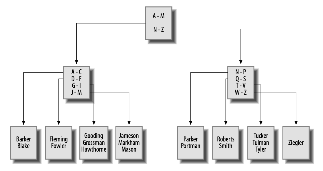 Nếu bạn đưa ra một truy vấn để truy xuất tất cả employees có họ bắt đầu bằng G, Server sẽ xem xét nút nhánh trên cùng (được gọi là nút gốc) và theo liên kết đến nút nhánh xử lý họ bắt đầu bằng A đến M. Đến lượt nó, nút nhánh này sẽ hướng máy chủ đến một nút lá chứa họ bắt đầu bằng G đến I. Sau đó, máy chủ bắt đầu đọc các giá trị trong nút lá cho đến khi nó gặp giá trị không bắt đầu bằng G ( mà, trong trường hợp này, là 'Hawthorne').
